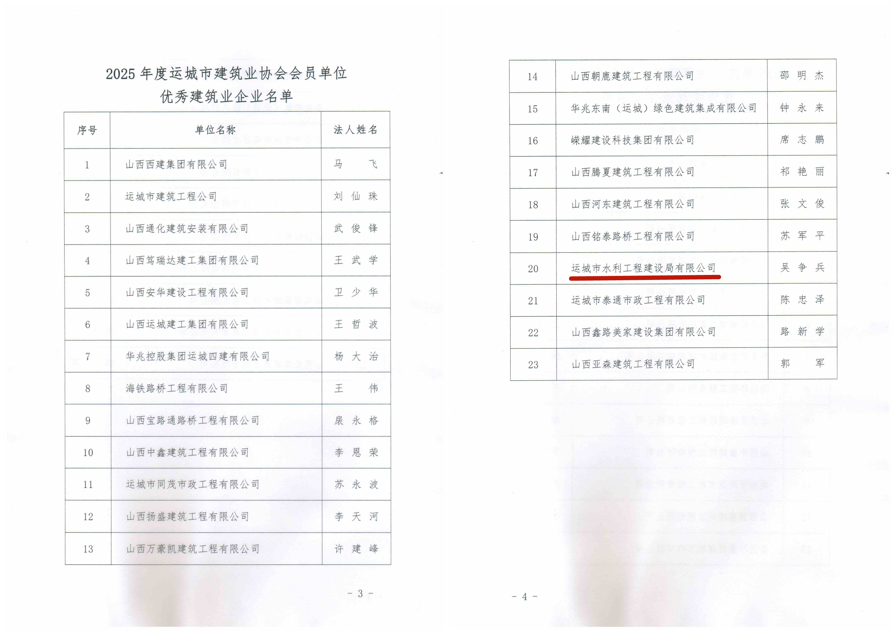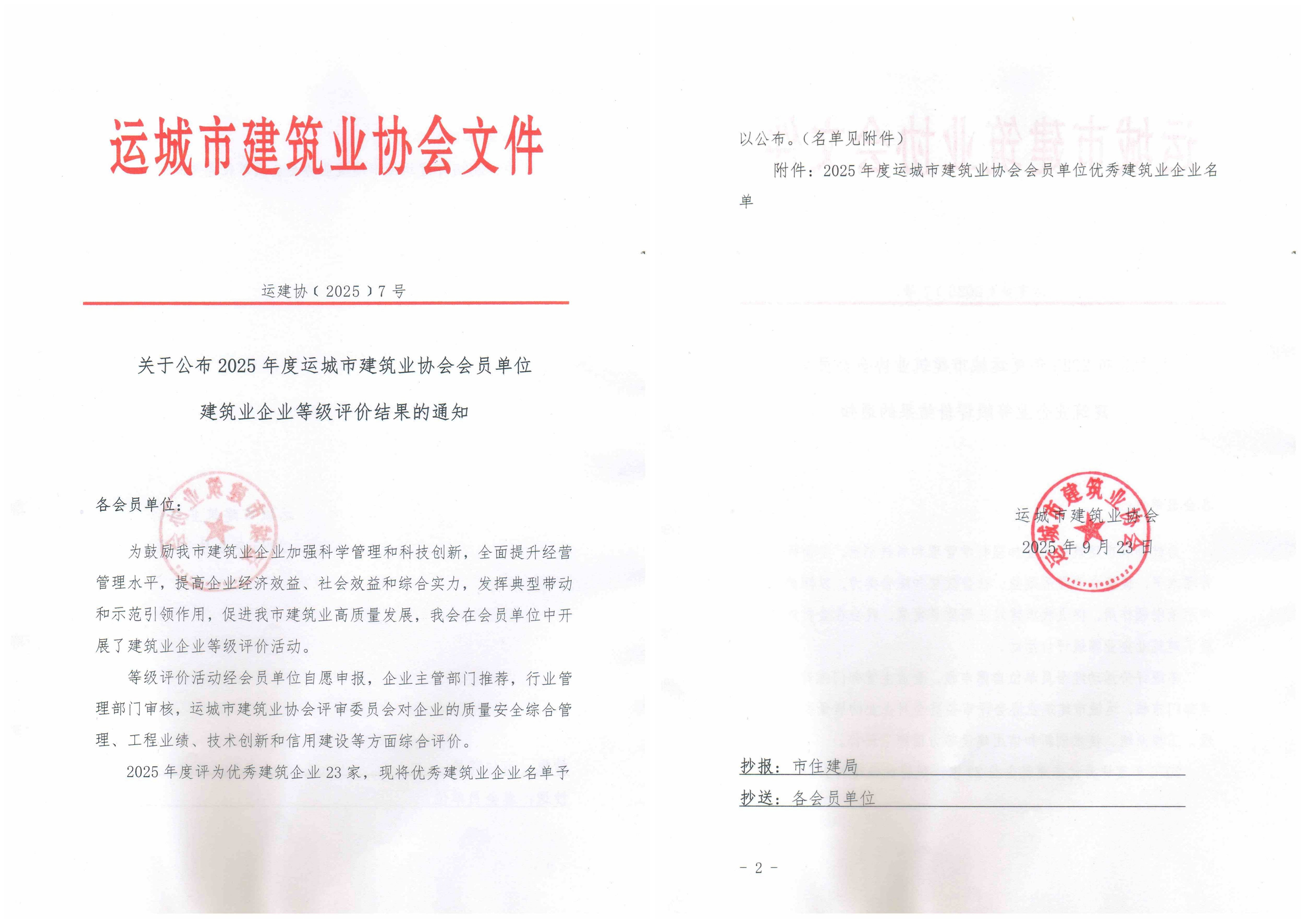 近日,运城市建筑业协会发布了《关于公布2025年度运城市建筑业协会会员单位建筑业企业等级评价结果的通知》,我公司荣获2025年度优秀建筑业企业称号。