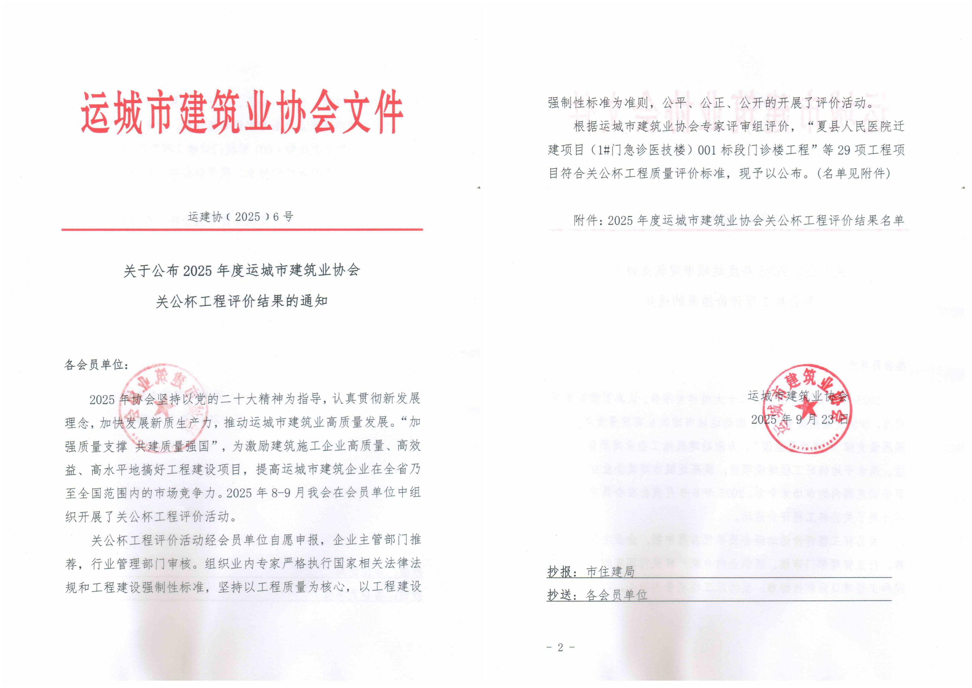 近日,运城市建筑业协会发布了《关于公布2025年度运城市建筑业协会关公杯工程评价结果的通知》,我公司承建的汾河流域生态修复汾河干流稷山城区段综合治理工程施工标荣获2025年度运城市“关公杯工程”荣誉。